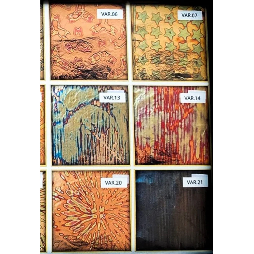Tropical Glitz Variegated Leaf is a premium metal leaf product designed to bring unique and vibrant patterns to your projects. Made from a base metal such as pure copper or imitation gold, each leaf undergoes a chemical treatment to create intricate, colorful patterns. The heat-treated process ensures that each piece features beautiful, metamorphic designs with rich and intense colors, making it an excellent choice for decorative and artistic applications.